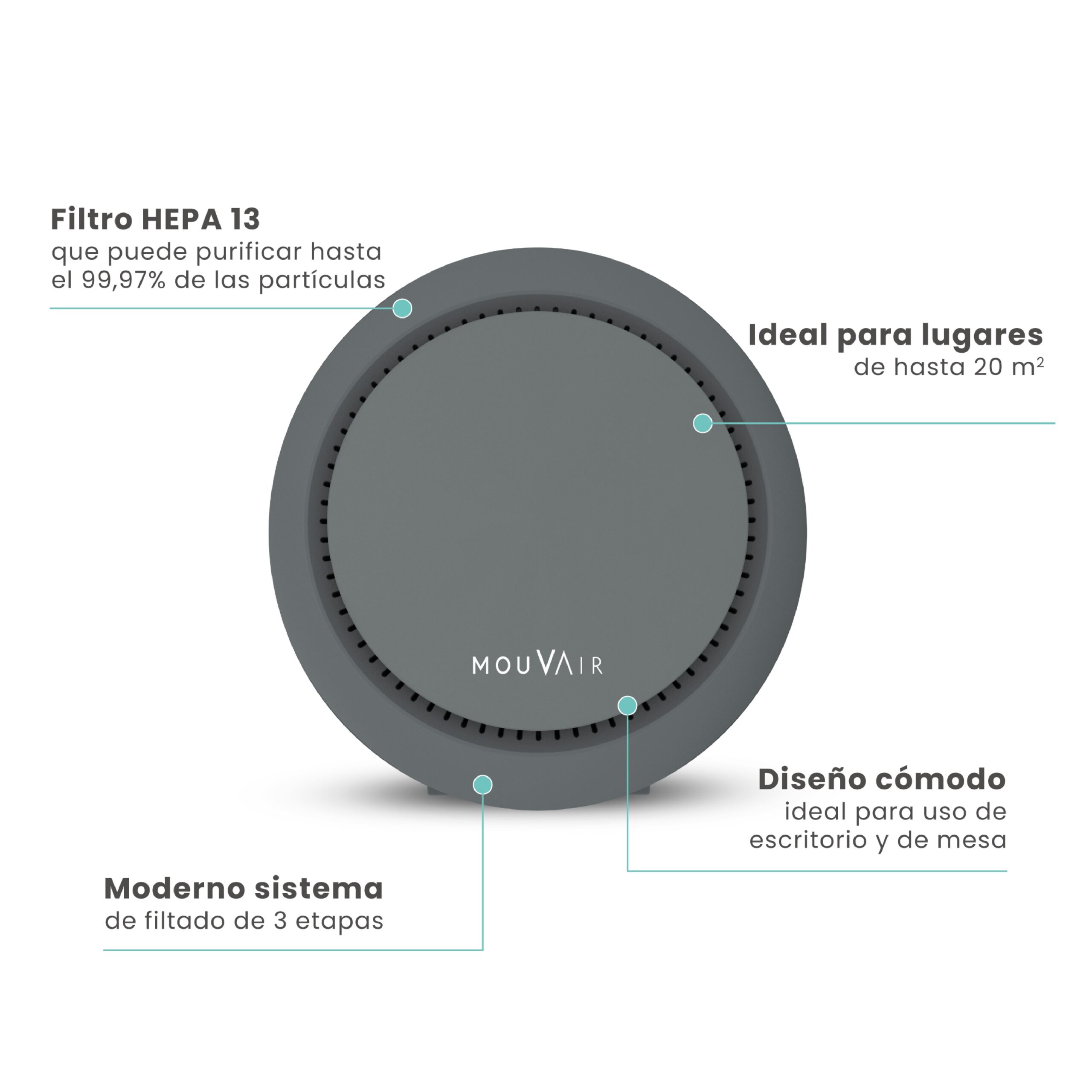 El purificador Mouvair Om limpia el aire, eliminando el 99,97% de contaminantes gracias a Filtro H13, Carbono activado y Luz UV-C. Compacto y elegante, ideal para espacios pequeños, previene alergias y problemas respiratorios. Color Negro
