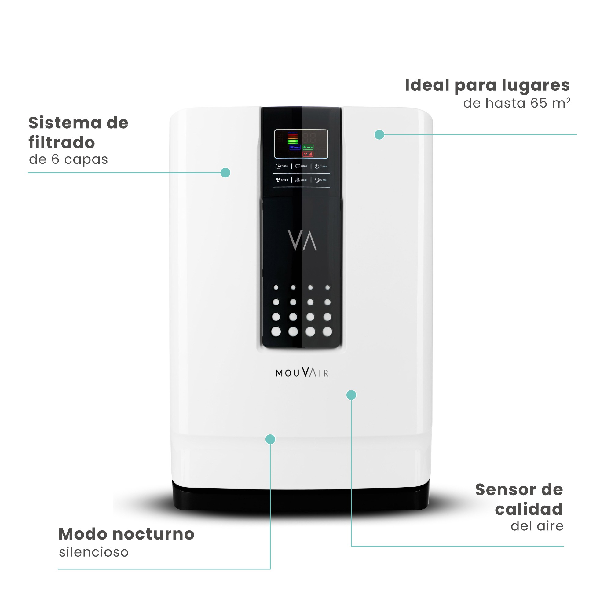 El purificador de aire Mouvair Zen sanitiza tu ambiente de manera eficaz, ya que elimina hasta el 99.97% de las partículas contaminantes —como el polvo, alérgenos, moho, polen, pelo de mascota, virus o bacterias— lo que te permite mejorar tu calidad de vida y ayudarte a prevenir y aliviar los síntomas del asma, alergias y otras enfermedades respiratorias.